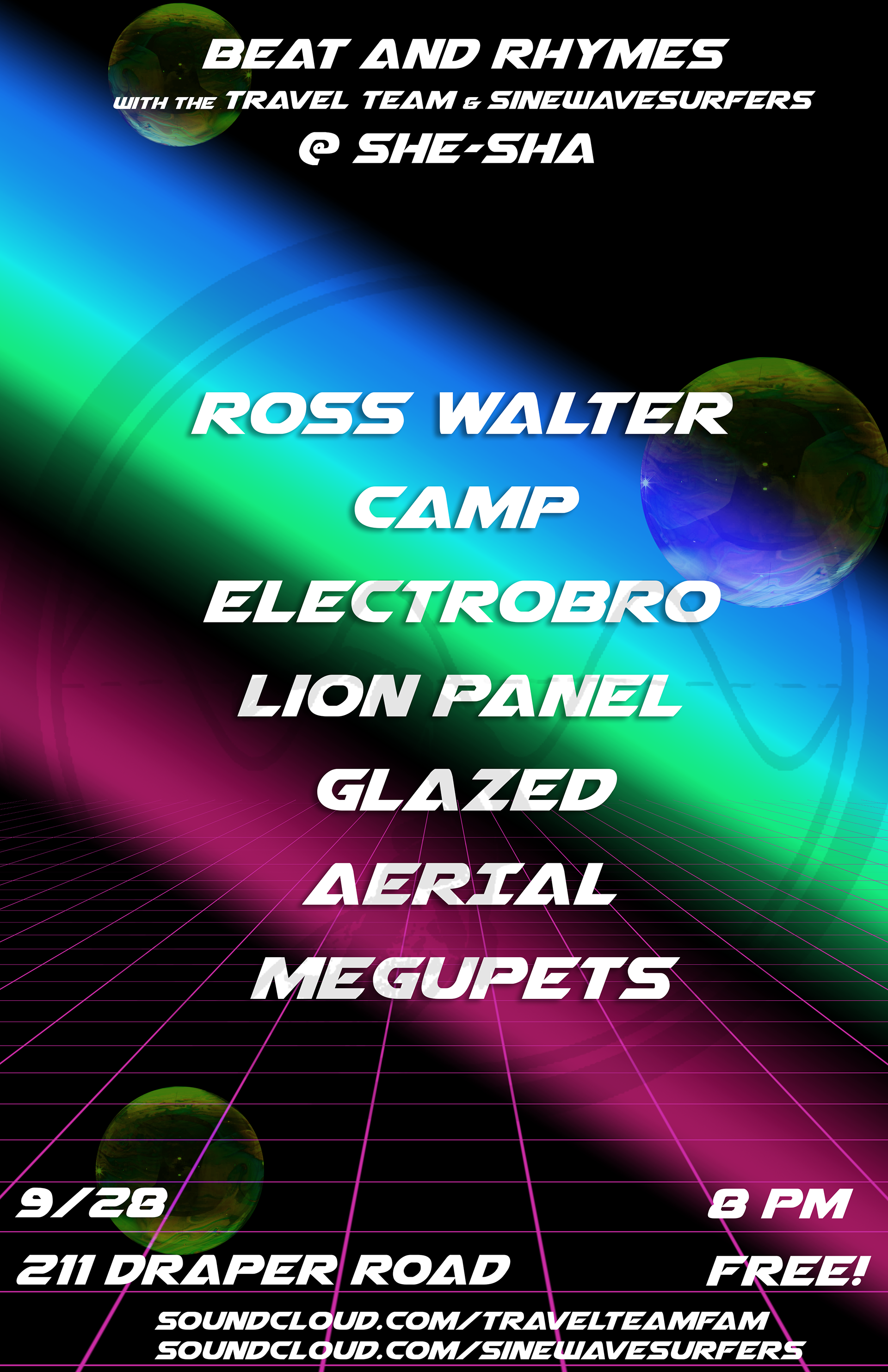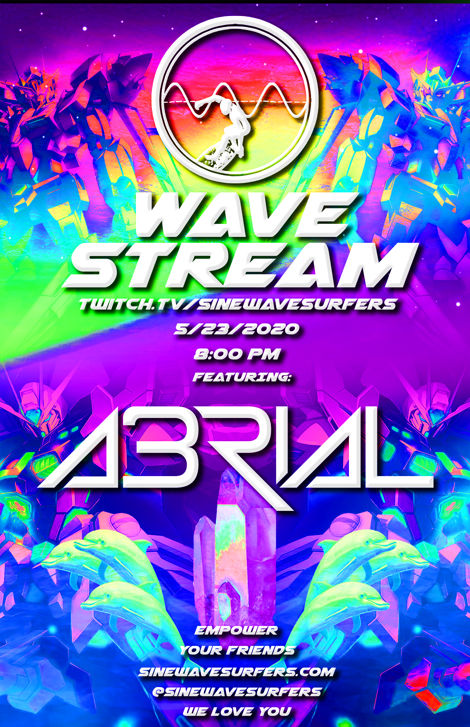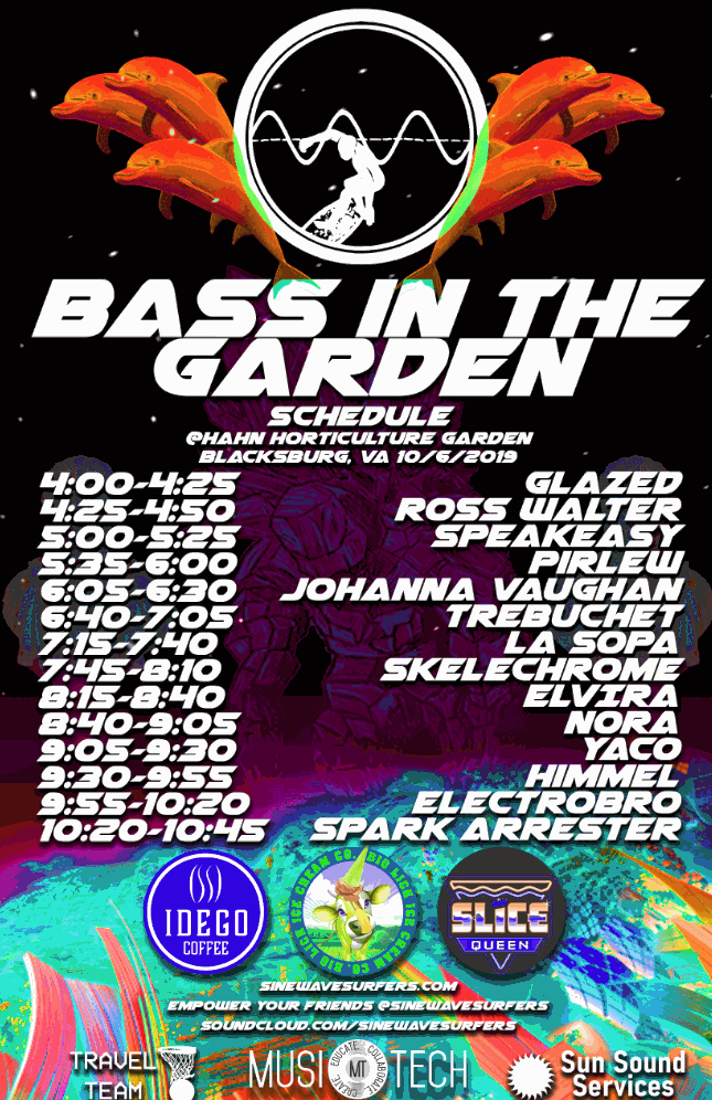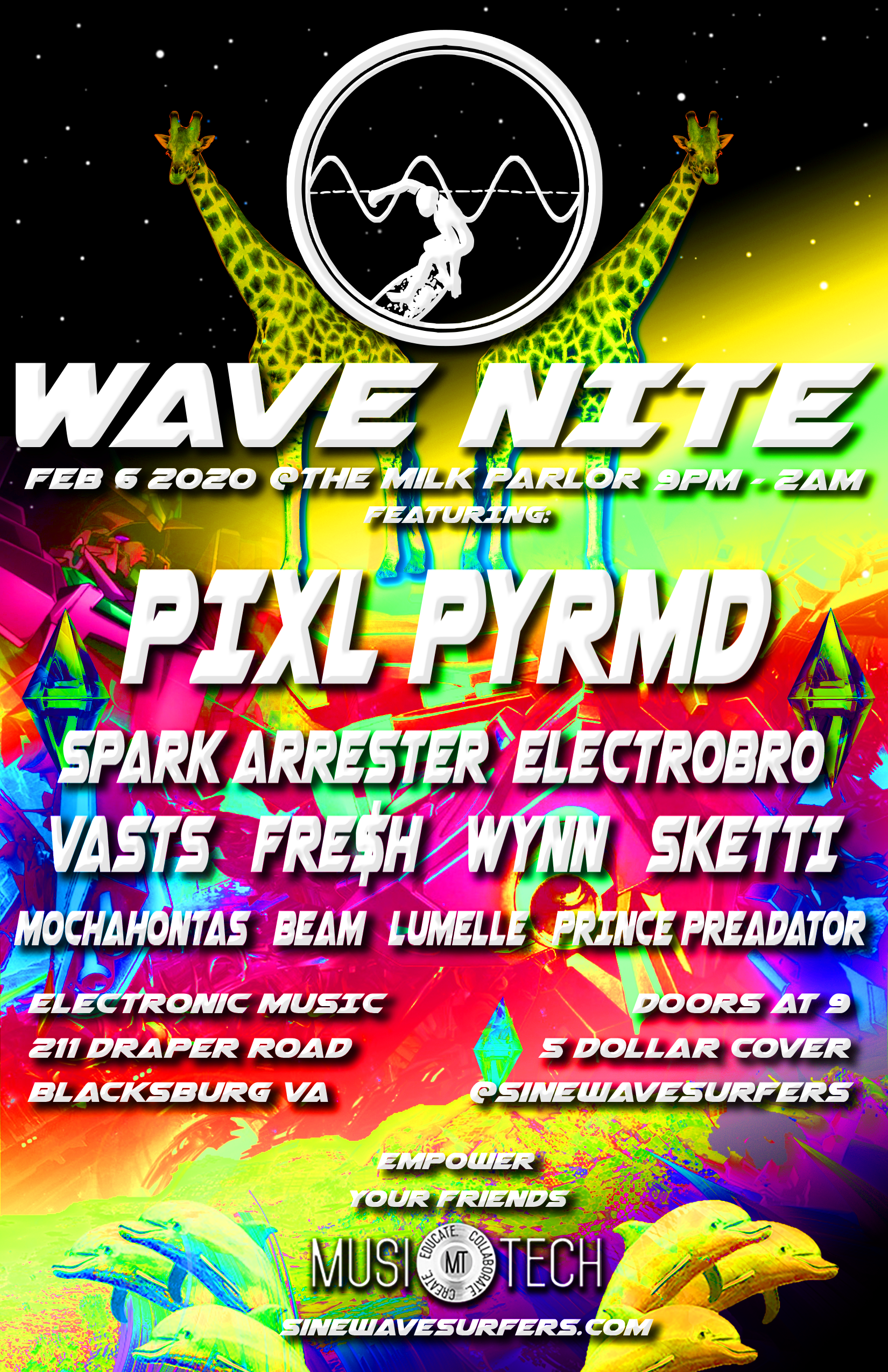 TheSe posters Began out of necessity when I realized that we needed artwork for our music events. So I began experimenting with Photoshop and after Creating the ONIICHAN project, the art style from that seemed to migrate over to the Sine wave surfers world. Below is a collection of Posters that were made to advertise events and workshops that we put on.